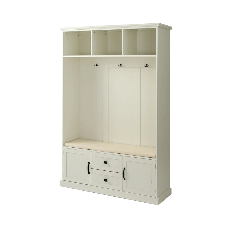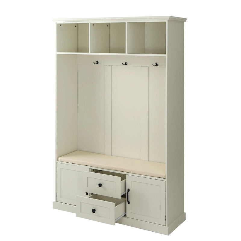 Hall Tree with 3 Hooks, Coat Hanger, Entryway Bench, Storage Bench, 3-in-1 Design, 47.2INCH, for Entrance, Hallway DescriptionClassic details give our Storage Locker a traditional look, but clean lines and a modern finish bring this hall tree into the now. Generous, sweeping crown molding accents the top of the case; 3-open cubbies lie below it, awaiting your display items, books, accessories and more. The open area beneath the cubbies features elegant beaded-board paneling, 3-double hooks for coats and bags, and a comfortable seat with cushion. The grand finale of this mudroom storage piece, 2-drawers and 2-doors that allow you to store away even more necessitie.Features 1. A hall tree which decorate your entryway and organize your coat, shoes and any other belongings, make your entryway tidy and become a good helper for your home life.2. Three open storage shelves, 3 metal double hooks, with shoes bench and shoes storage space in the bottom, maximize storage function of your entryway, avoid clutter in the home, at the same time save your space of your home.3. Including assembly manual and all necessary hardware and fasteners. Components are pre drilled and pre cut for assembly.Advantages1. For such a tall product falling prevention is critical in order to prevent accidental injuries on a daily basis.That's why we're equipped with a sturdy anti-dumping device.You can refer to the manual for the specific operation method.2. 2.Hardware packs and instruction manual will be shipped with the product to users in one parcel. The instruction manual gives logical and clear illustrations for installation, and users can install this cabinet without any problem as long as they follow the steps rightly. Users need to get your own electric drill and take about 2 hours to install this coat rack completely if there are two adults. Weights & DimensionsHall Tree:70.9H x 15.74W 13.37 W x 14.3 DCushion Size:1.18 H x 13.38 W x 43.7 DSpecificationsPieces Included:1 Hall TreeTop Shape:RectangleTop Material:Particle BoardBase Material:Particle BoardPurposeful Distressing Type:NOWheels Included:NOBuilt-In Lighting:NOShelves Included:YesNumber of Shelves:3Drawers Included :YesNumber or Drawers:2Cabinets Included:YesNumber of Cabinets:2Country of Origin:ChinaLevel of Assembly:Full Assembly NeededSuggested Number of People for Assembly/Install:2Estimated Time to Set Up:1HAdult Assembly Required:YesEligible for Replacement Parts:SomeEligible for Hardware Packs:YesAdditional Tools RequiredNot Included:Power Drill recommendedNotes1.Manual measurement has been used, there may be some reasonable error, thanks for your understanding.2.Due to factors such as display equipment and shooting environment, the color of the item may be slightly different from the picture, which is a normal phenomenon, please refer to the actual item3.Improper use of screws may cause the product surface damage! Please be careful when installing.4.It is recommended to put a layer of foam or soft cushion on the floor when installing to avoid scratching the floor.