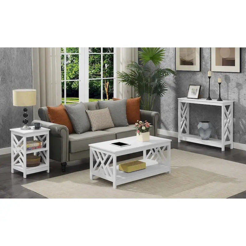 Reinvent your living room with the transitional style of the Titan End Table with Shelves by Convenience Concepts. This simple yet eye-catching end table showcases a sleek design with its unique dimensional side panels. Two additional shelves provide convenient storage or display space to meet ones entertainment and storage needs. This carefully crafted unit is constructed from MDF and finished with non-lead-based paint for safe, long-term use. Coordinate this geometric end table with additional pieces from the Titan Collection by Convenience Concepts, each sold separately.