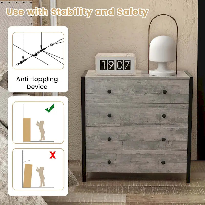 4 pull-out drawers offer enough space to neatly store and display your clothes, books, and decorations, keeping your space clean and organized. For reliable structure, the dresser is supported by sturdy wooden frame for long-lasting use. Considering safety use, anti-toppling device is equipped to provide added safety and stability, ensuring the storage organizer stay securely in place. All in all, the 4-drawer chest is applicable to various occasions, making it a perfect combination of storage, display and decoration.