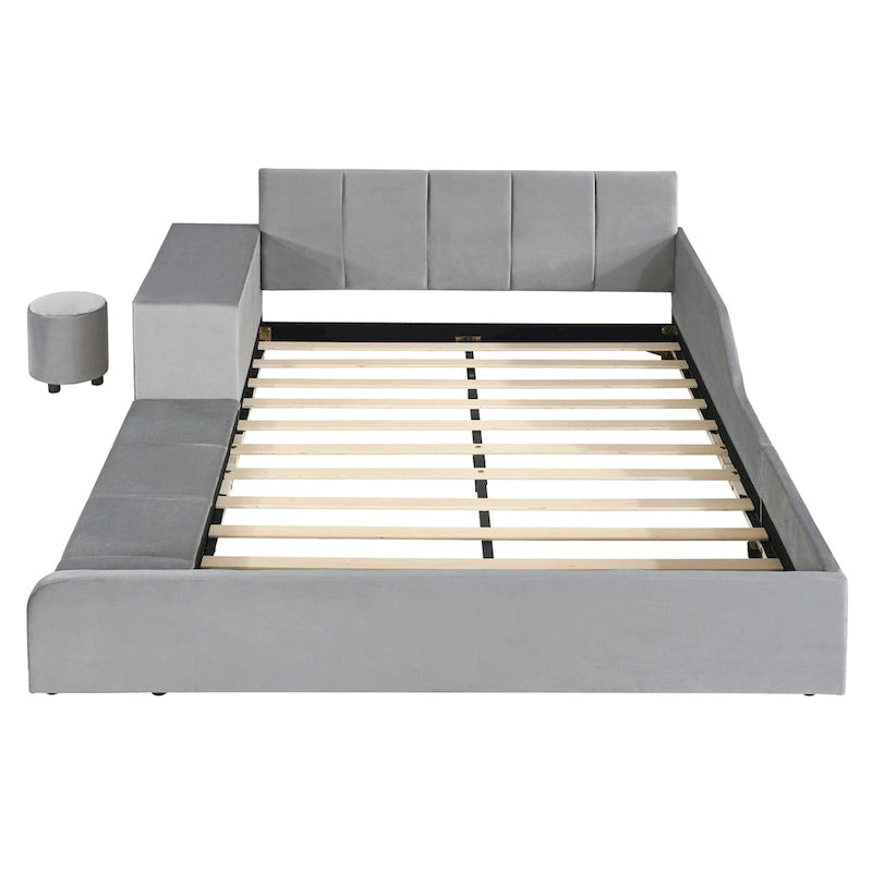 This beautiful Upholstered Platform Bed adds an elegant chic look to your bedroom and is upholstered in thick velvet fabric to add extra comfort. It is a perfection for the little growing child for there are upholstered bed rail around, which provide both safety and softness.And when the little sweet grows, he can try to study and play on the bedside desk.It provides a warm and soft space for the parent to accompany child to grow up.This grounded upholstered bed will be both a beautiful piece in the room and a place full of fun for your family