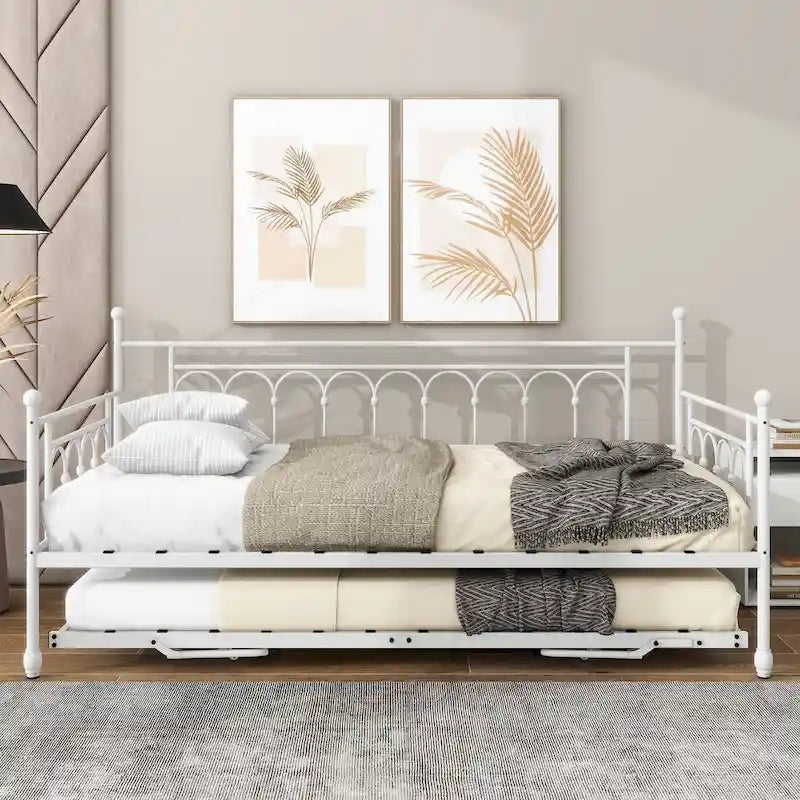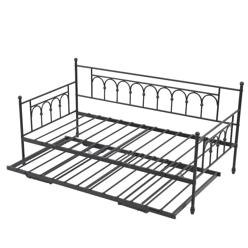 Xingzjojor versatile and modern twin size steel daybed with adjustable pop up trundle, add a rugged focal point to your room with this industry style bed to complement any space. The steel design showcases a smooth curved steel piping design, and smooth roll-out trundle offers convenience and space-saving capability, while eliminating the need for a box spring, simplifying setup and maintenance. With a surface powder coat finish that prevents rusting, crafted with robust and enduring steel and metal, this bed ensures long-lasting durability, promising years of reliable use. The trundle is equipped with braces that make it easily rise to the height of a bed, offering an inviting place to rest, Perfect for kids' sleepovers or accommodating guests.