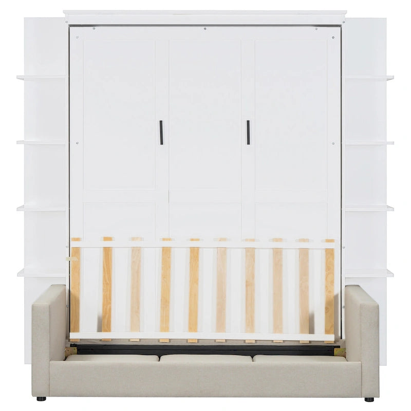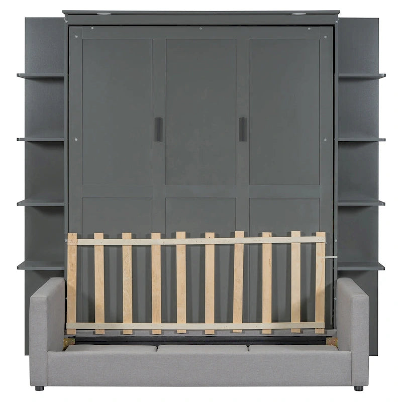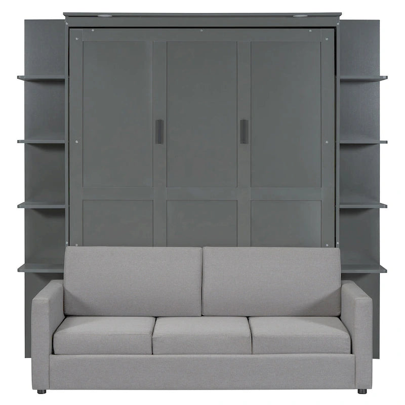 Queen Size Murphy Bed with Sofa, LED Lights & Shelves