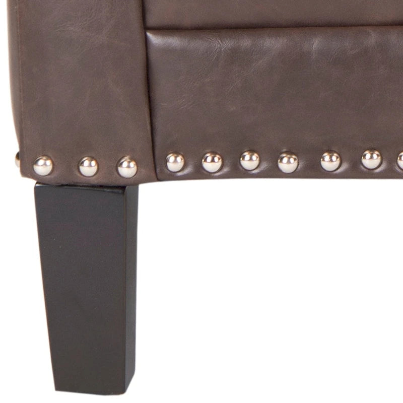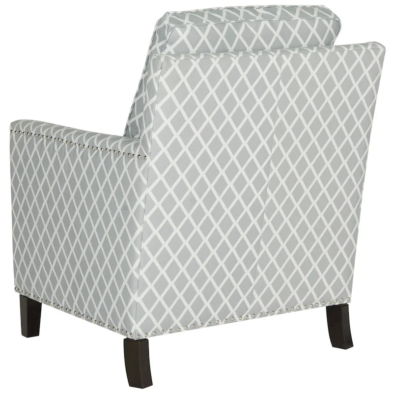 A classic silhouette gets a fresh new look in this Club Chair. Trendy and transitional, Buckler is luxuriously comfortable in a white diamond patterned fabric, with silver nail head trim and espresso finished birch wood elevating the familiar form to the height of fine contemporary decorating.