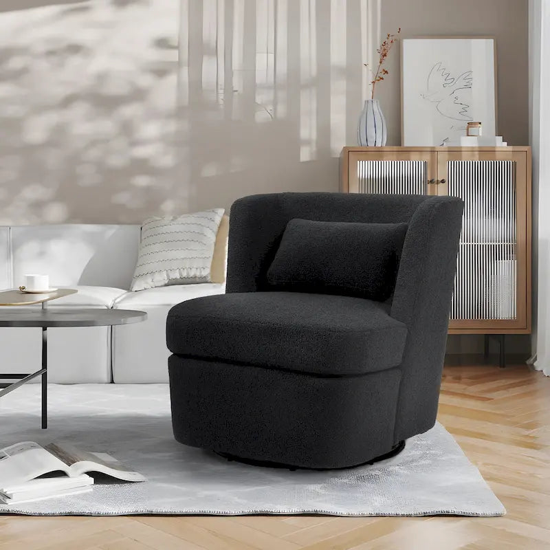 Upgrade your space with our stylish barrel chair, the perfect blend of comfort and modern design. High-density foam ensures long-lasting plushness, while the supportive backrest and cushion provide superior stability. Available in luxurious Boucle or breathable cotton-linen fabrics, it offers a cozy touch for any setting. The sturdy 360 swivel base and ergonomic design maximize functionality, making it ideal for small spaces without sacrificing style. Whether for your living room, office, or bedroom, this chair delivers comfort and elegance in one seamless package.