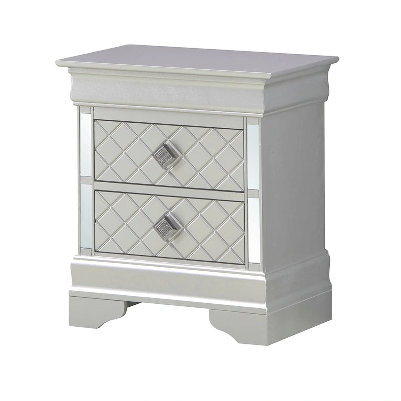 The Verona Nightstand by Glory Furniture is the definition of perfect style and function. This fully assembled bedside nightstand is finished with real wood veneers over manufactured and solid wood. The drawers feature center supported, metal glides for a smooth movement. Each drawer is dovetailed on the front and back, exuding solid construction at a value price. The drawer bottoms are supported with corner blocks for added stability. The piece boasts chrome pull hardware, mirrored edging and faux crystal details. Bring style and form to your bedroom with this beautiful nightstand.